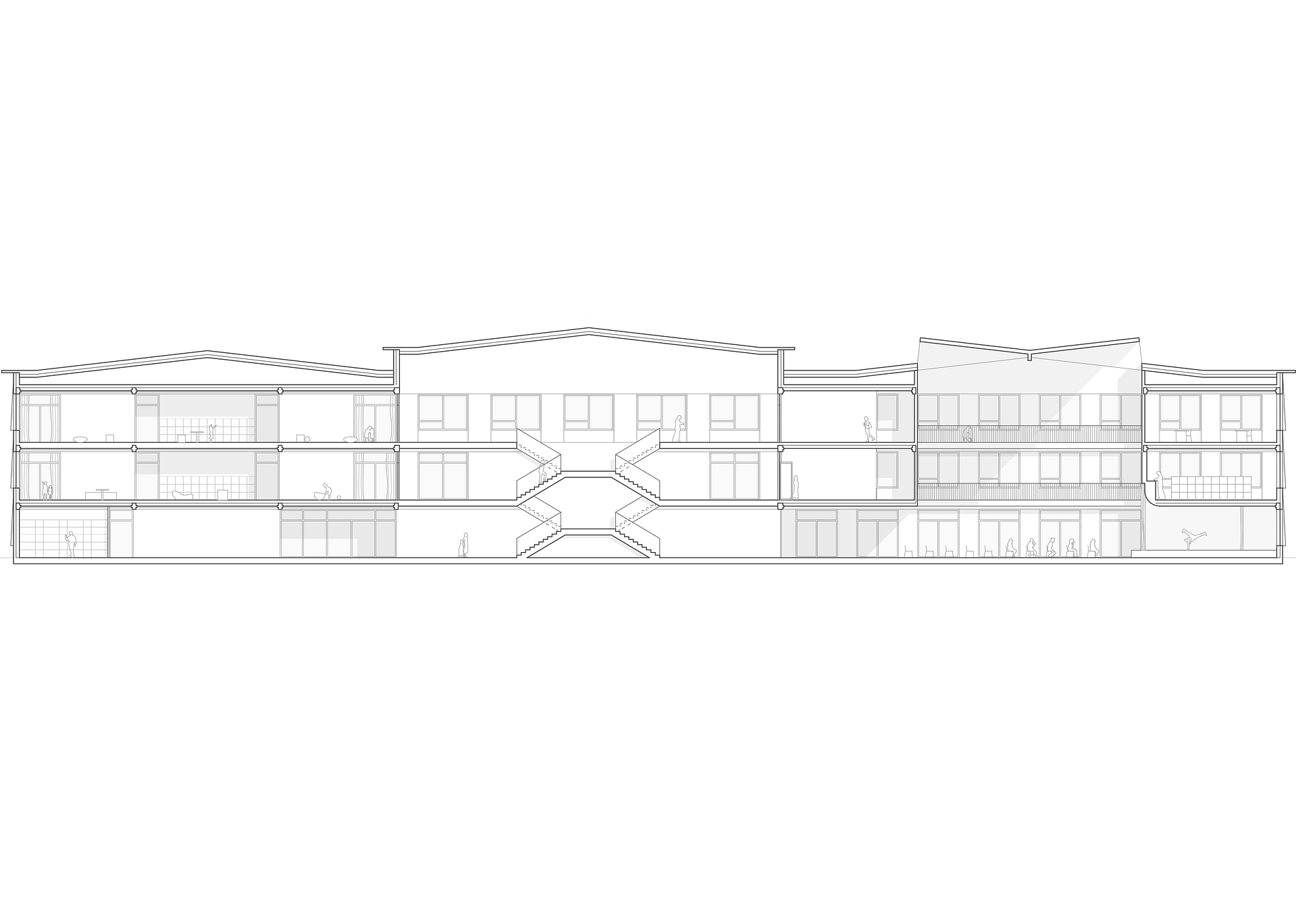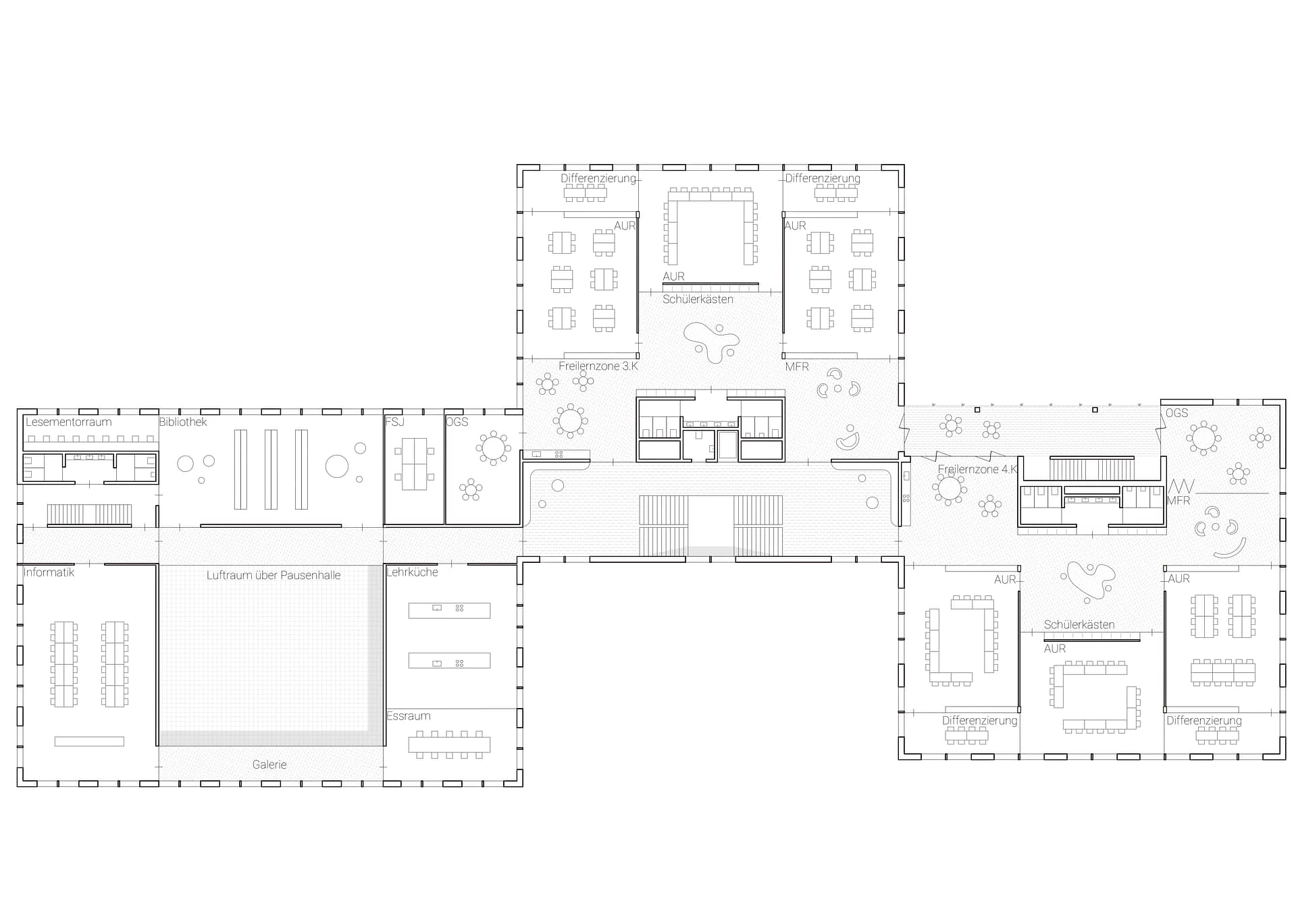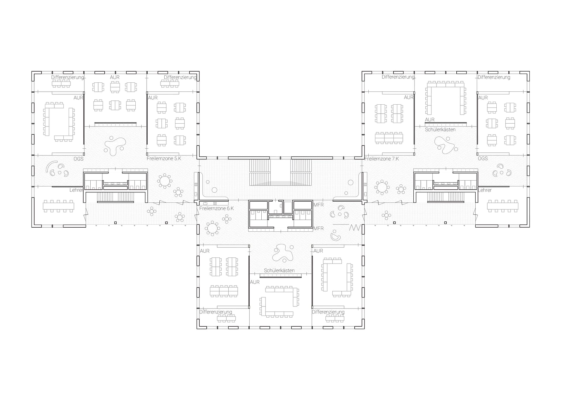 Ein Ensemble, dass sich in die heterogene Bebauung des Ortes Timmendorfer Strand einfügt und gleichzeitig eine selbstbewusste Adresse und Strahlkraft entwickelt, ist die Intention des Entwurfes für einen Neubau der GGS Europaschule Timmendorfer Strand. Die Baukörper, die sich auf dem schmalen Grundstück entlang der Poststraße zwischen Straßenraum und Sportlandschaft aufreihen, bestehen aus zwei Hauptgebäuden, die sich wiederum durch Vor-und Rücksprünge, zum Schutz des erhaltenswerten Baumbestandes, in einzelne „Häuser“ untergliedern. So gelingt es das Raumprogramm unterzubringen und gleichzeitig differenzierte, begrünte Hofsituationen im Außenraum und klar definierte räumliche Zusammenhänge im Innern herzustellen. Die Eingangssituation in der Mitte des Grundstücks ist der Auftakt des Schulensembles und ermöglicht die intuitive Zuwegung zu den Gebäuden. Die„Fuge“zwischen den beiden Hauptbaukörpern, die eine kontrollierte Verbindung zwischen Straßenraum und geschützten Schulhof schafft, dient als „Katalysator“, der zum einen eine Durchwegung zum Schulhof und den Sportplätzen zulässt und zum anderen einen notwendigen Schutz für einen störungsfreien Schul-und Sportbetrieb sicherstellt. Die Dachformen und Giebel der einzelnen „Häuser“ unterstützen die Orientierung und Identifikation der Nutzungsbereiche auf dem Grundstückund lösen den maßstäblichen Konflikt zwischen der sehr großen Schulnutzung und kleingliedrigen Nutzung der Umgebung maßvoll auf. Sowohl die Klassenräume der Grundschule, als auch die Klassenräume der Gemeinschaftsschule sind als Cluster organisiert. Neben den brandschutztechnischen Vorteilen ermöglicht diese Organisation wohnungsähnliche Raumzusammenhänge für jeweils drei Klassenräume mit zwei zugeschalteten differenzierungsräumen und einer Freilernzone mit Schülerkästen und einem Sanitärkern. Die Gebäudeversprünge korrespondieren mit den geschossweisen Clusterzuordnungen und verfügen jeweils über eine Treppe und einen Laubengang als zweiten Fluchtweg zum angrenzenden Cluster. Der Treppenraum im mittleren Versprung des jeweiligen Hauptgebäudes wird jeweils als großzügiger Haupttreppenraum mit zugeordnetem Aufzug ausgebildet. Das Schulgebäude ist als Hybridbau konzipiert und kombiniert tragende Elemente aus Stahlbeton mit konstruktiven Holzelementen zu einem nachhaltigen und leistungsfähigen Bauwerk. Die gewählte Bauweise vereint die Vorteile beider Materialien-die Robustheit und Dauerhaftigkeit von Stahlbeton mit der ökologischen und ästhetischen Qualität von Holz. Der hohe Vorfertigungsgrad der Holzelemente reduziert zudem die Bauzeit vor Ort und minimiert Lärmemission in der Bauphase. Die Gebäudestruktur lässt größere räumliche Flexibilität zu und kann somit leichter auf zukünftige Nutzungsänderungen reagieren.